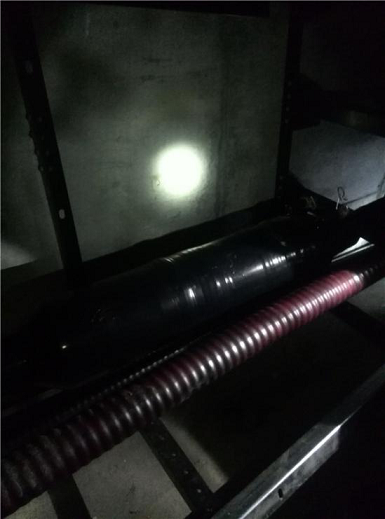 經(jīng)過(guò)測距設備檢測故障位置距離測試端30米。設備再次加壓,在故障位置明顯看到有燃弧現象,定位完畢。