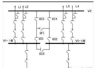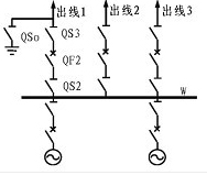 單母線接線圖見圖1。圖中倒閘操作:如對(duì)饋線LI送電時(shí),須先合上隔離開關(guān)QS2和QS3,再投人斷路器QF2;如欲停止對(duì)其供電,須先斷開QF2,然后再斷開QS3和QS2。即隔離開關(guān)相對(duì)于斷路器而言要“先通后斷”,母線隔離開關(guān)相對(duì)于線路隔離開關(guān)也要“先通后斷”。接地開關(guān)QS4是在檢修電路和設(shè)備時(shí)合上,取代安全接地線的作用。