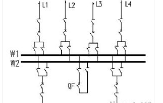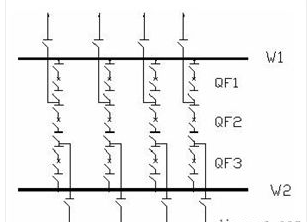 雙母線接線見圖5。具有兩組母線W1、W2。每回線路都經(jīng)一臺(tái)斷路器和兩組隔離開關(guān)分別與兩組母線連接,母線之間通過(guò)母線聯(lián)絡(luò)斷路器QF(簡(jiǎn)稱母聯(lián))連接,每一個(gè)電源回路也是通過(guò)一臺(tái)斷路器和兩組母線隔離開關(guān)接在兩組母線上。