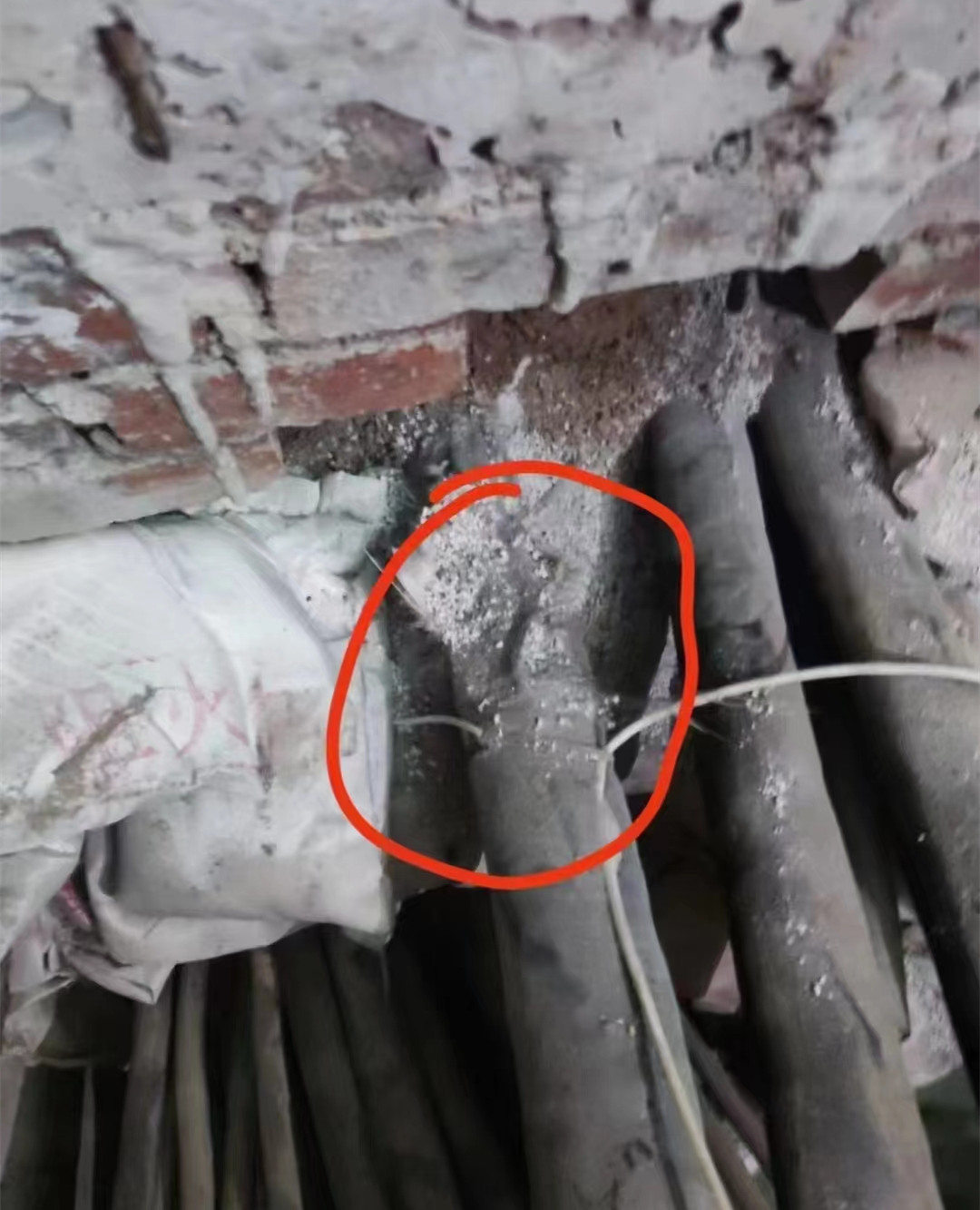 經(jīng)過(guò)查找確認(rèn)在故障點(diǎn)兩?左右附近聽(tīng)?微弱放電聲?,??在這附近開(kāi)挖,挖開(kāi)后發(fā)現(xiàn)有電纜破損修復(fù)的痕跡。